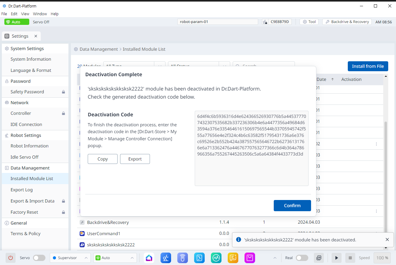 Po vydání kódu pro deaktivaci modulu je modul okamžitě deaktivován.