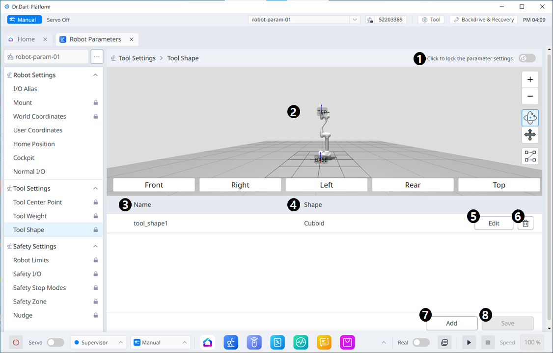 Tvar nástroje lze nastavit v modulu parametry robota > Nastavení nástroje > tvar nástroje. Další informace naleznete v části Nastavení tvaru nástroje.