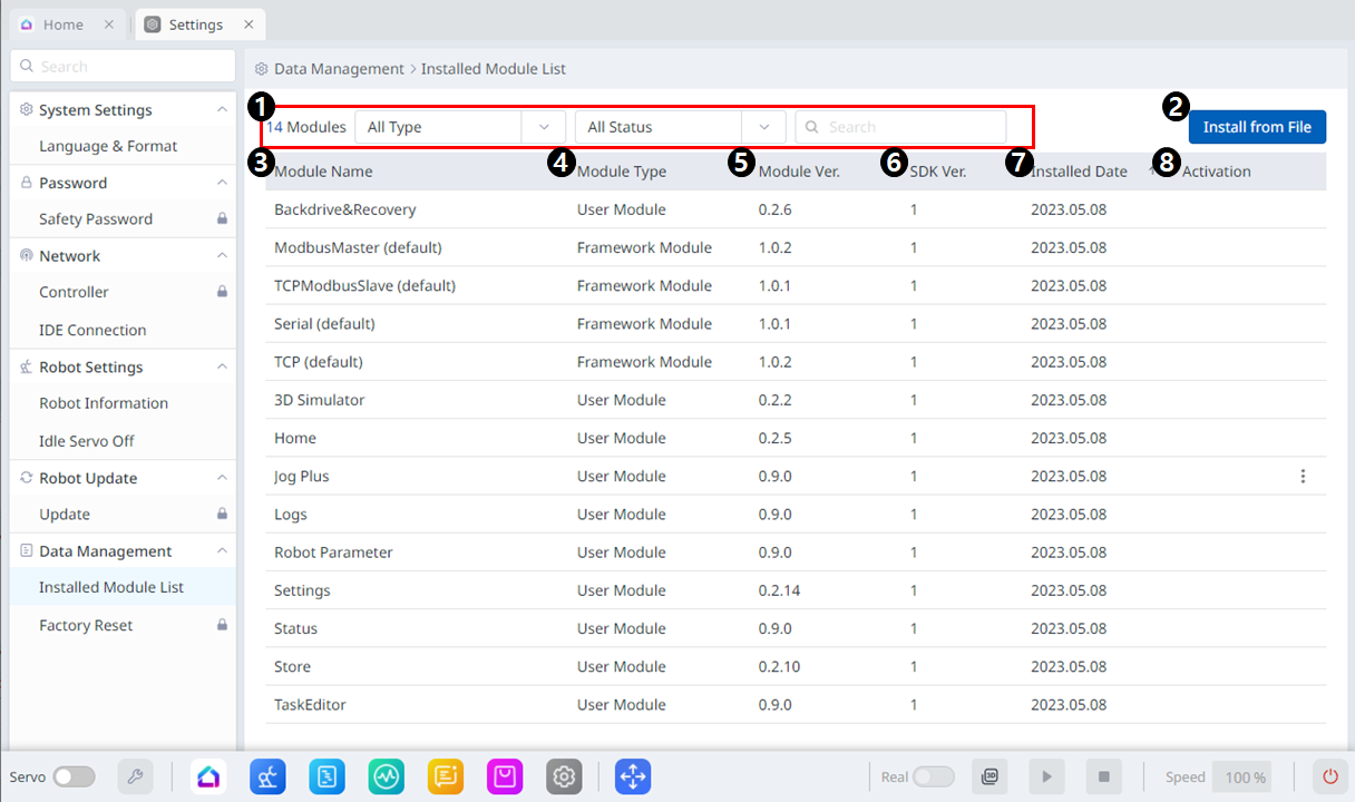 | 6 | Datum instalace | Data, kdy byl každý modul nainstalován, jsou vidět. |