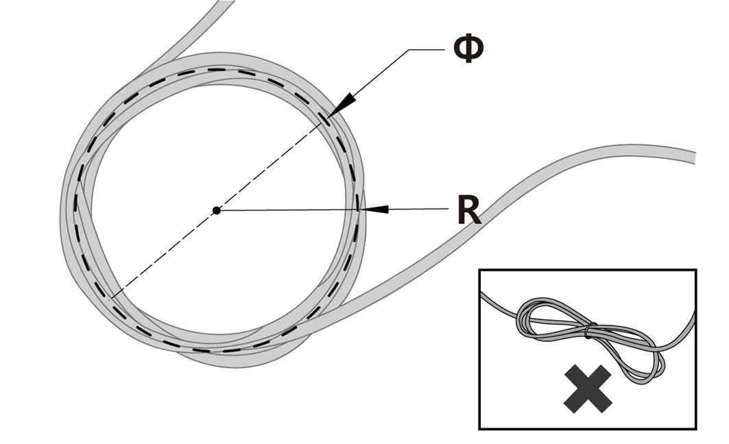Pokud je poloměr zakřivení menší než minimální poloměr zakřivení, může dojít k odpojení kabelu nebo poškození produktu.