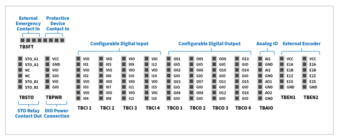 - Svorkovnice pro výstup bezpečnostních kontaktů (TBSTO): Připojuje se k napájecímu vedení periferních zařízení robota, takže když robot přejde do stavu STO, vypne se rovněž napájení periferních zařízení.
