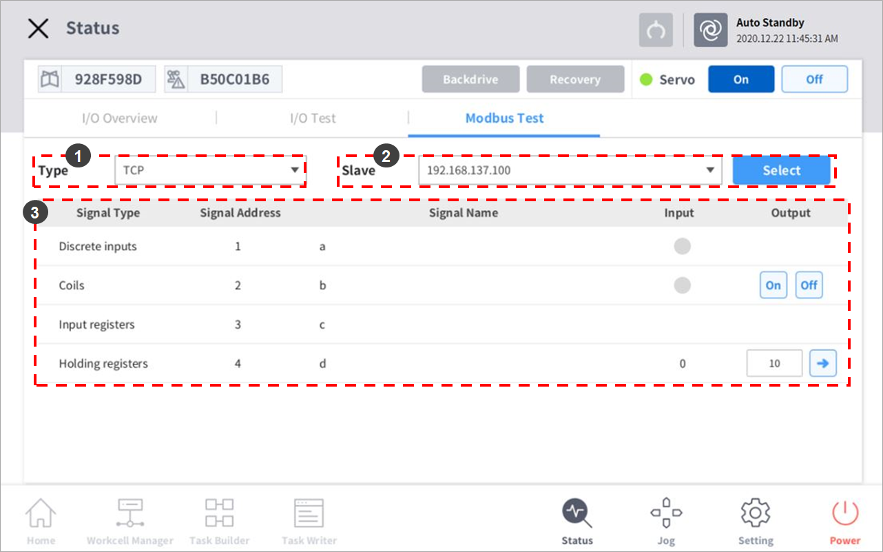 Jedná se o nabídku umožňující kontrolu a testování signálů Modbus nastavených v Modbus TCP, Modbus RTU a předdefinovaný Modbus.