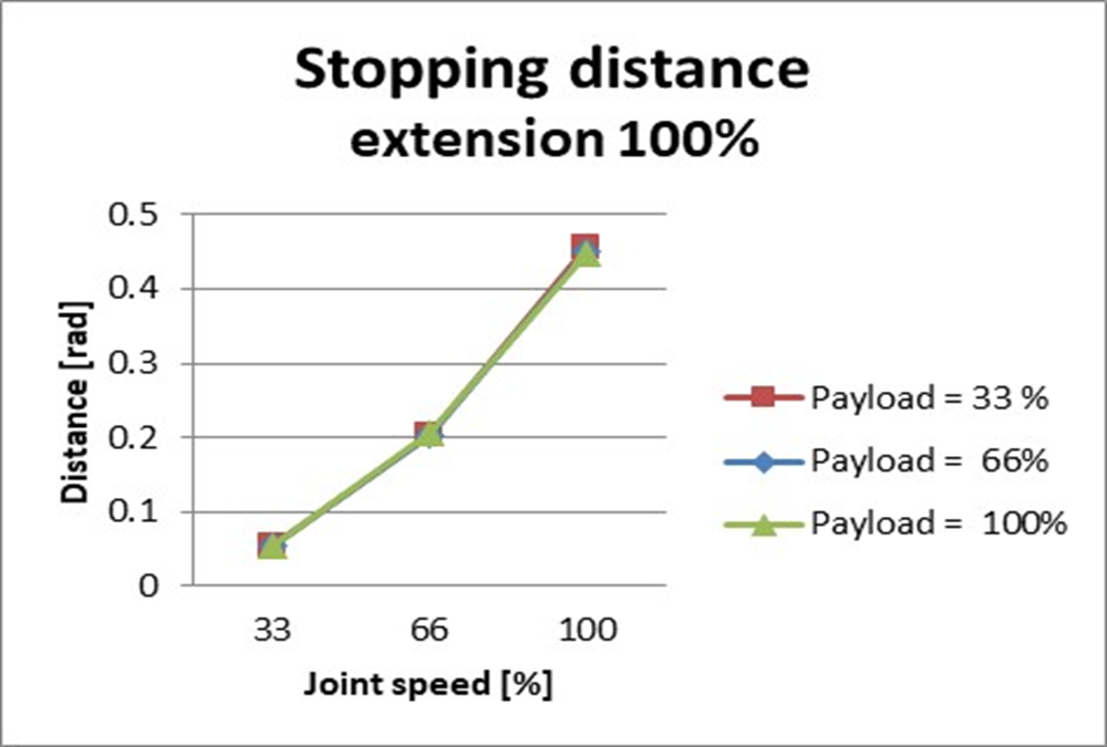 Zastavovací vzdálenost a zastavovací čas kloubu 2 (rameno)