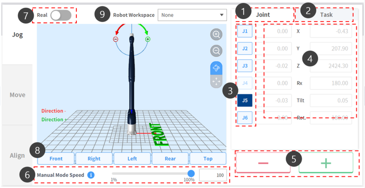 4 | Coordinate Display | Zobrazí se souřadnice robota, které jsou v režimu Pojíždění momentálně aktivní. Pokud se poloha robota změní kvůli stisknutí tlačítka směru, změní se také souřadnice. |