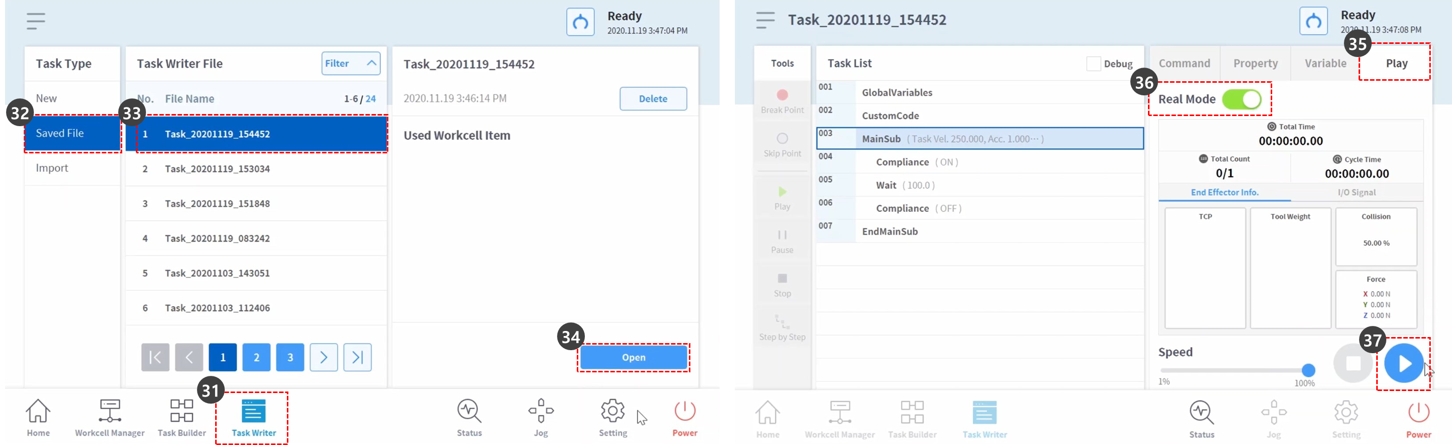 Před výběrem položky zkontrolujte, zda je název prvního souboru úlohy názvem úlohy v kroku 2. Poslední uložená úloha se nachází v horní části seznamu souborů aplikace Task Writer.