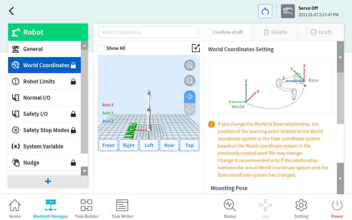 Lze nastavit systém souřadnic představující robota a obrobek. Tento systém souřadnic se nazývá Světové souřadnice, a je odlišný od Základnových souřadnic základny, které jsou fixovány k základně. Pomocí Světových souřadnic lze nastavit pozici Základnových souřadnic, přičemž Světové souřadnice lze vybrat, když se provádí učení a posouvání pomocí robota v režimu Task Builder a Task Writer. Chcete-li nastavit Světové souřadnice, klepněte na tlačítko
