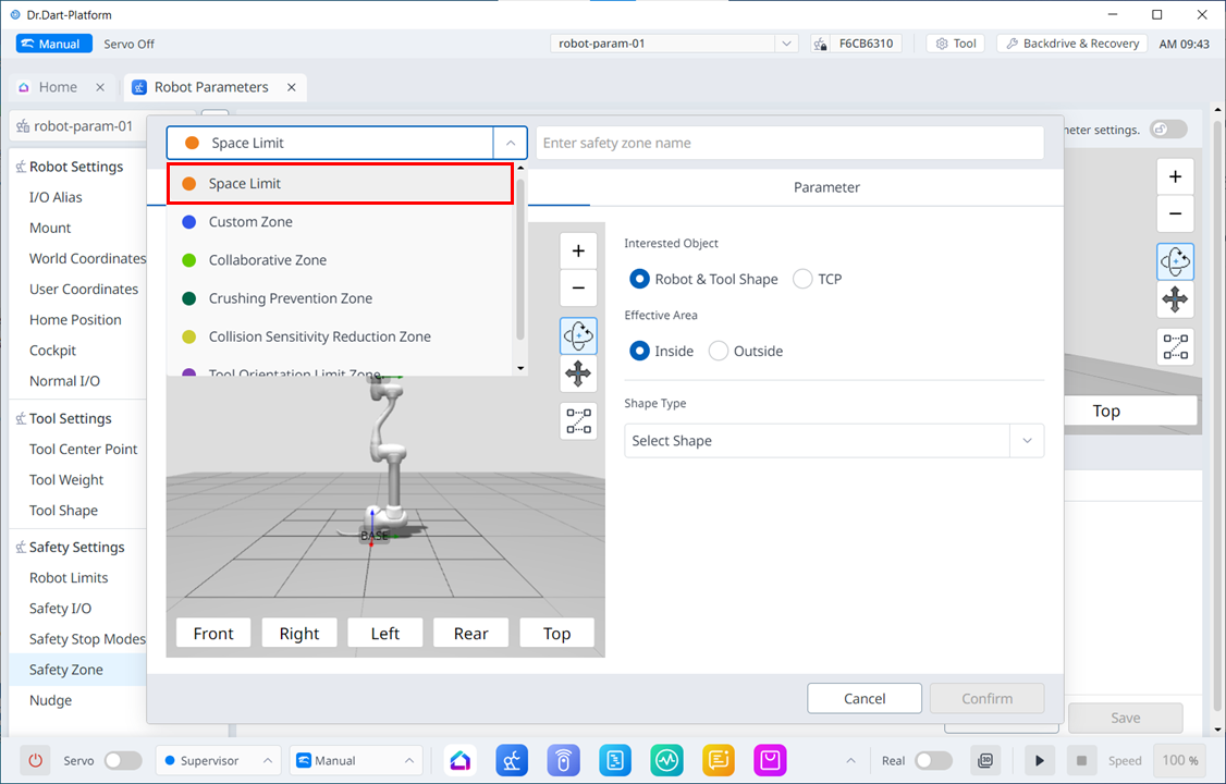 Die Speicherplatzbegrenzung kann über das Dropdown-Menü oben links in Roboterparameter > Sicherheitseinstellungen > Sicherheitsarbeitsbereiche > Neuen Arbeitsbereich hinzufügenerreicht werden. Unter Formtyp können Sie Kugel, Zylinder, Würfel, gekippter Würfel oder Polyeder zum Festlegen auswählen.