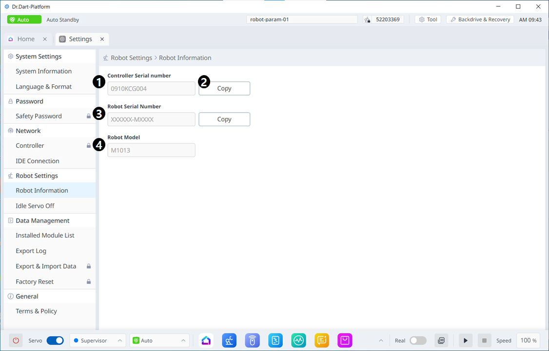 | 3 | Seriennummer Des Roboters | Hier wird die Seriennummer des Roboters angezeigt. |