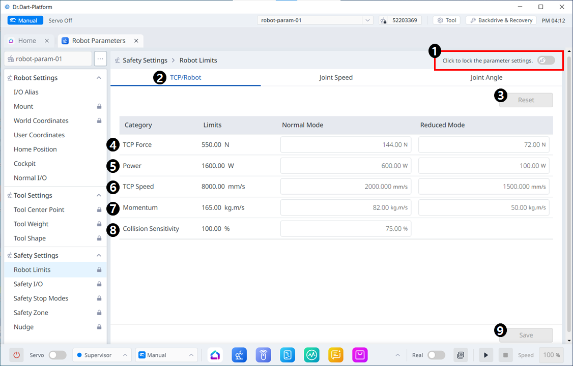 Robotergrenzen können unter Roboterparameter > Sicherheitseinstellungen > Robotergrenzen festgelegtwerden.