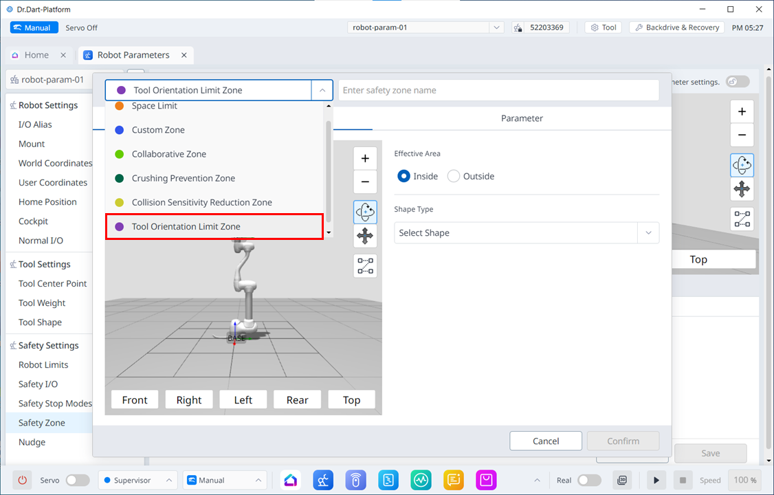 Um einen Grenzbereich für die Werkzeugausrichtung festzulegen, tippen Sie unter Sicherheitsarbeitsbereiche auf die Schaltfläche Neuen Arbeitsbereich hinzufügen. Und wählen Sie unter Begrenzungsbereich für Werkzeugausrichtung einen der folgenden Typen aus: Cube, Cylinder, Multiplane Box, Sphereoder Tilted Cuboid. Das Sicherheitskennwort ist während der Einrichtung und Aktivierung erforderlich.