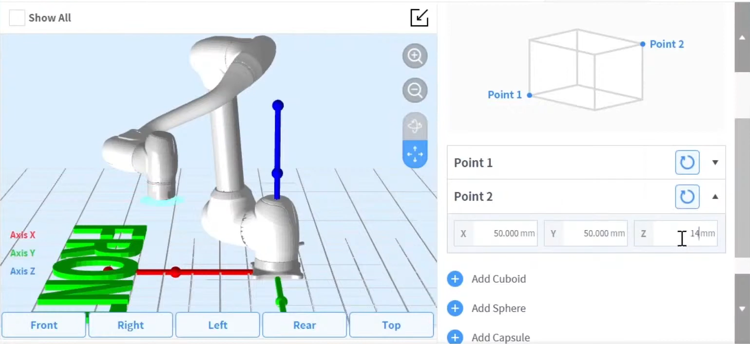 - Der Roboter ermittelt den Status der Verletzung der Raumgrenze basierend auf dem TCP (Tool Center Point) des Roboterendes und des Roboterkörpers. Wenn der eigentliche Roboter eine Werkzeugform hat, die größer als die eingestellte TCP ist, muss zum Schutz von Werkstück und Werkzeug eine Werkzeugform Workcell Item hinzugefügt werden.