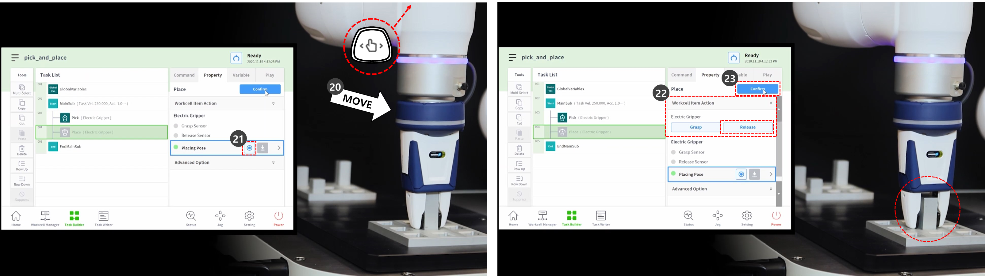 - Verwenden Sie direktes Teach-in, um den Roboter an den Punkt zu bringen, an dem Pick&Place beginnt.