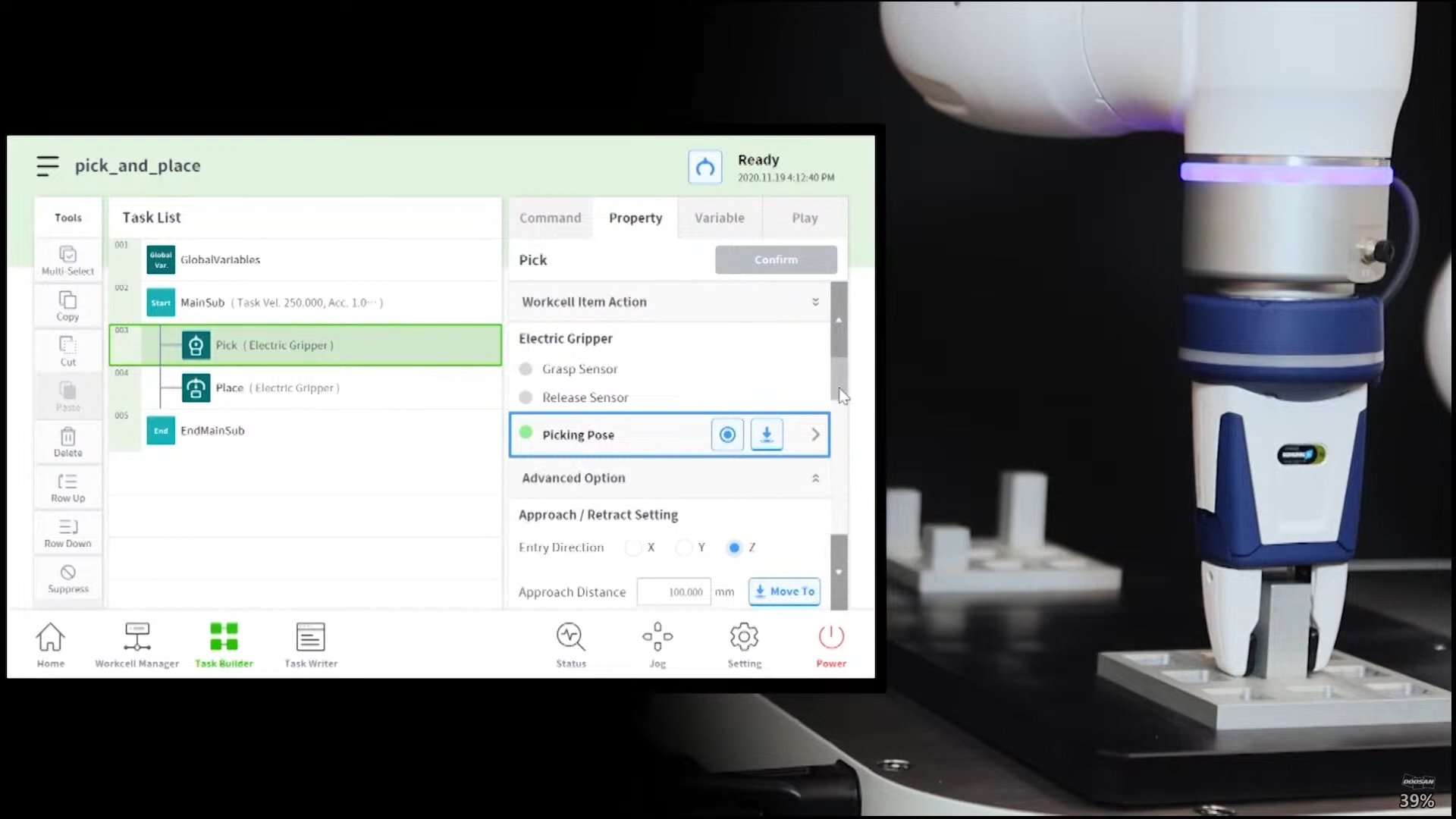 Um detaillierte Einstellungen für die Befehle „Pick and Place“ festzulegen, wählen Sie den Befehl „Pick“ in der dritten Zeile der Aufgabenliste aus.