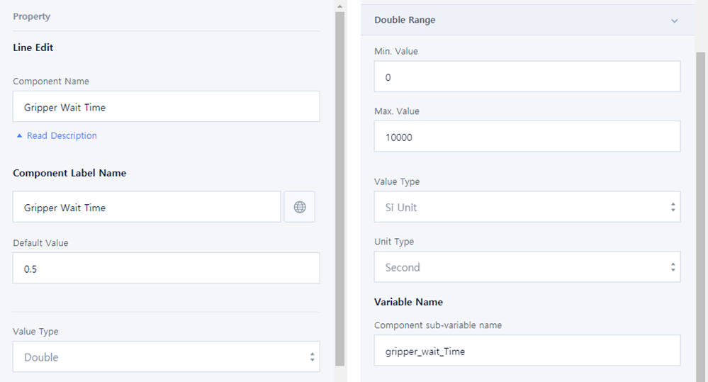 You can add a window to enter the value using ‘Line Edit’ UI Component. Configure the input window so that the waiting time is input after the gripper action.