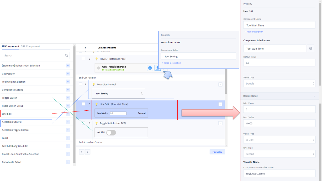 Add UI Component>Line Edit so that users can enter waiting time afteroperating Tool.
