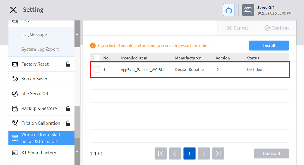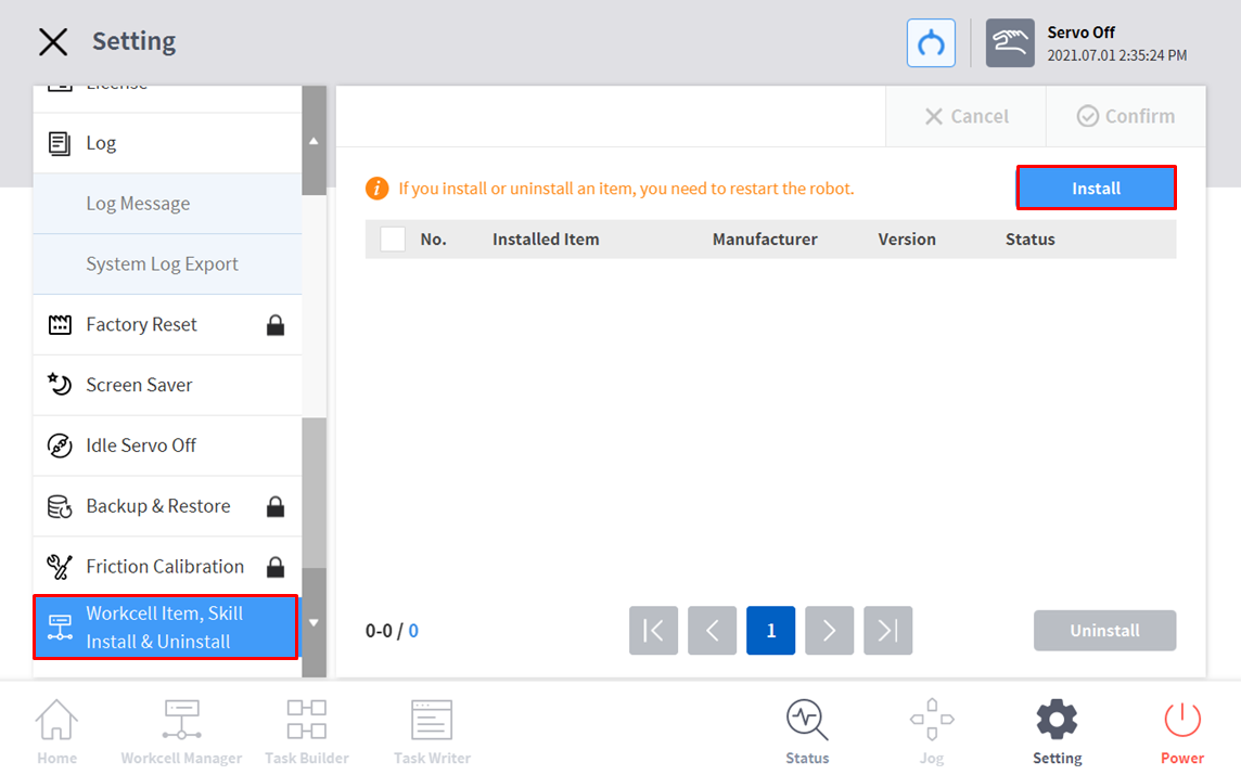 - Click ‘Workcell item, Skill Install & Uninstall’ from the ‘setting’ menu of Teach Pendant to check the item list.