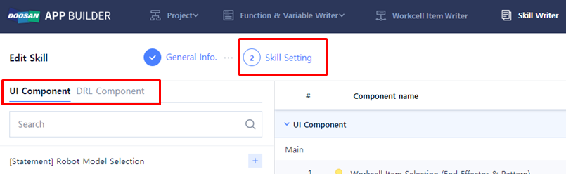 Step 3 is to fill out ‘Skill Setting’. Click ‘Skill Setting’ in the upper menu. In this step, fill out the DRLto add the UI of the user input screen used in the double-acting gripper Skill and the Skill function.