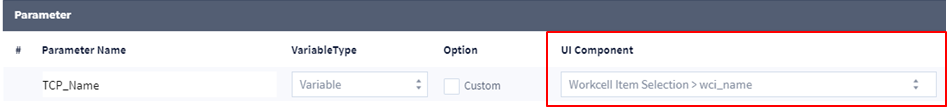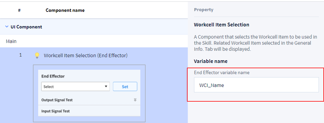 After selecting UI Component > Workcell Item Selection(End Effector), set Variable Name of WCI UI Component in Property> Variable name as follows.