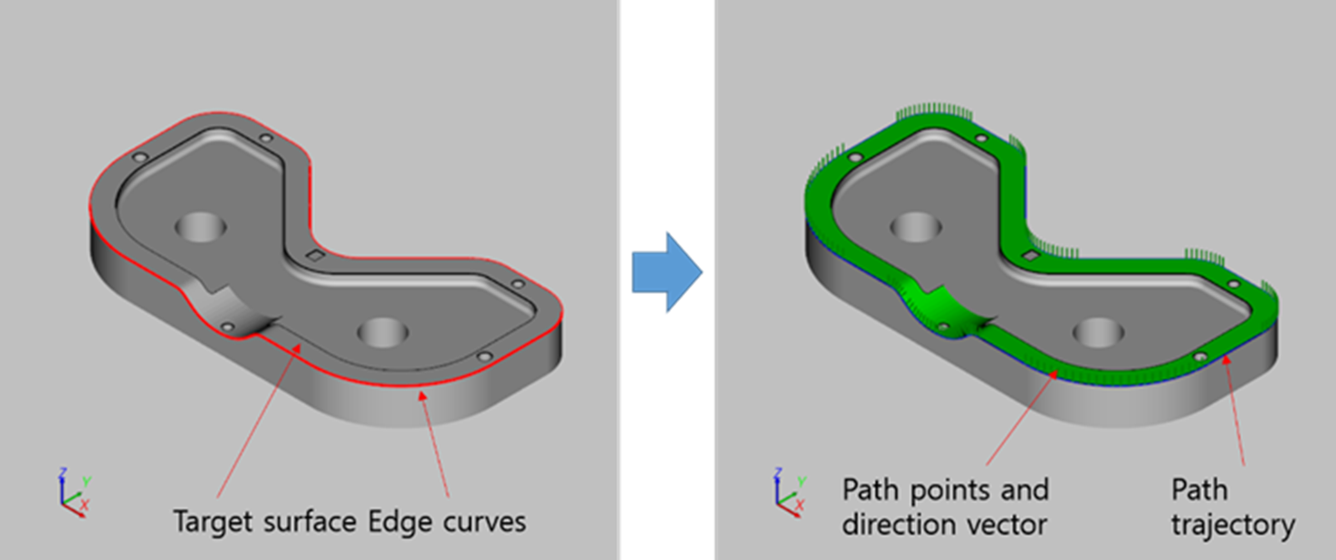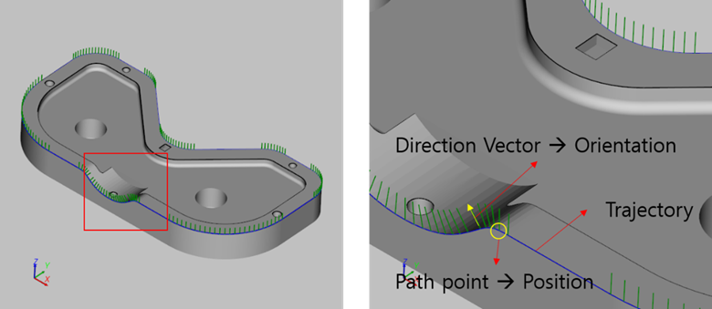 A path segment is a list of path points. The robot controller creates motion trajectory based on the points. Each path point defines position and direction vector. The direction vector means orientation at the position. The direction vector of a path point is initially set as the normal vector of the surface at the position.