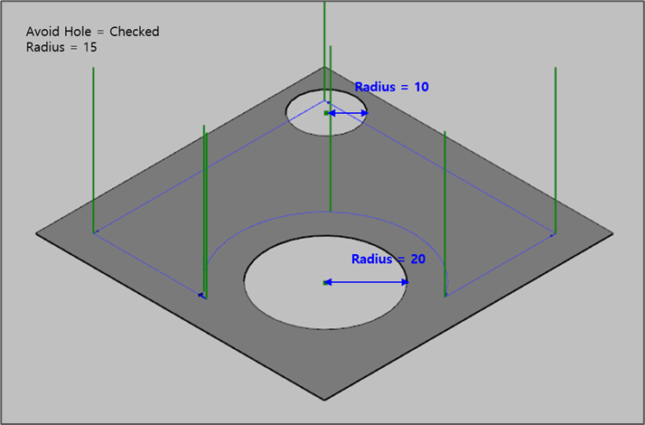 - Avoid Hole: When there is a hole inside the surface, the user can decide that the path ignores the hole or not. If the flag is the checked, the holes which its radius is less than the Radius value are ignored.