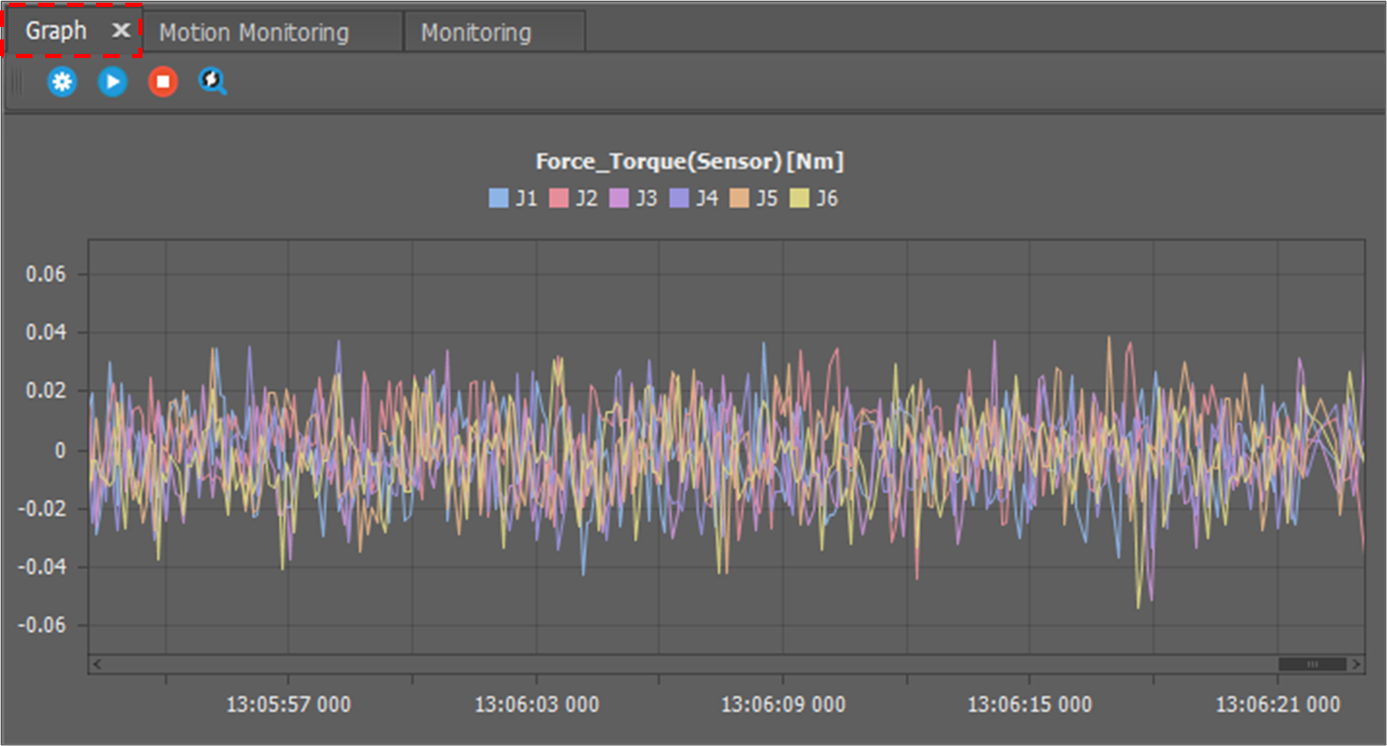 In each data graph, the X axis is time in milliseconds and the Y axis is the value of the data. Data is updated every 100 milliseconds and as new data is added, the graph flows from right to left.