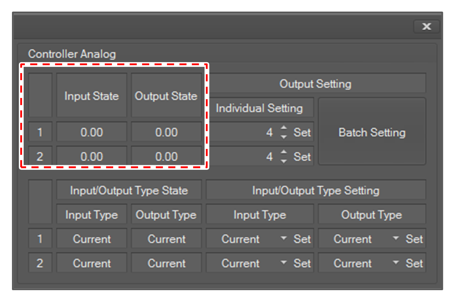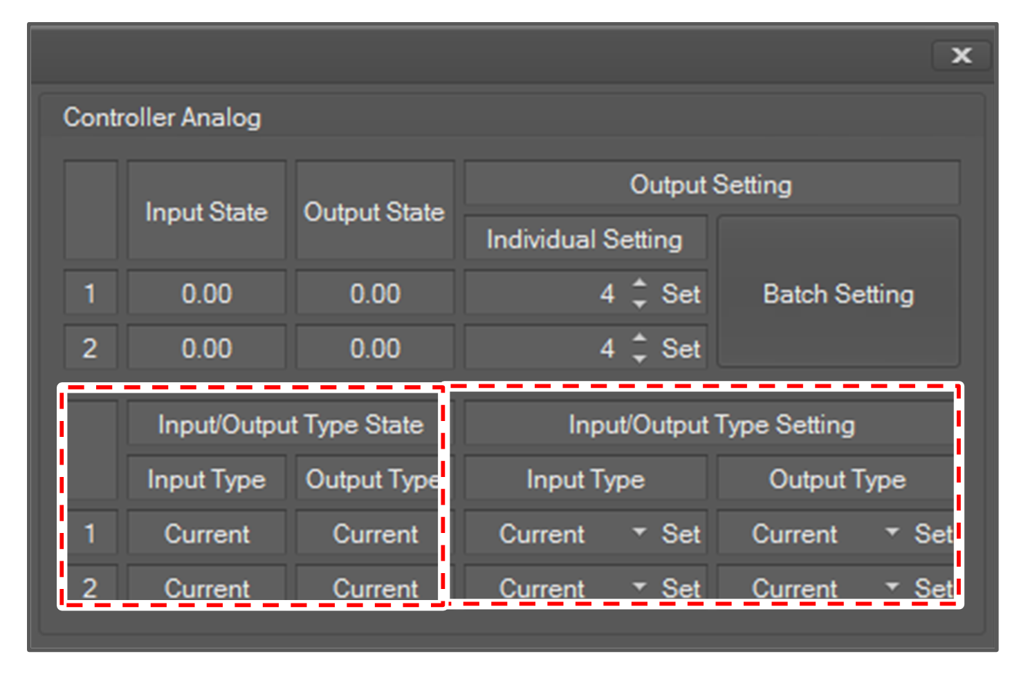 The analog input/output type state of the controller is displayed in the Input/Output Type State field.