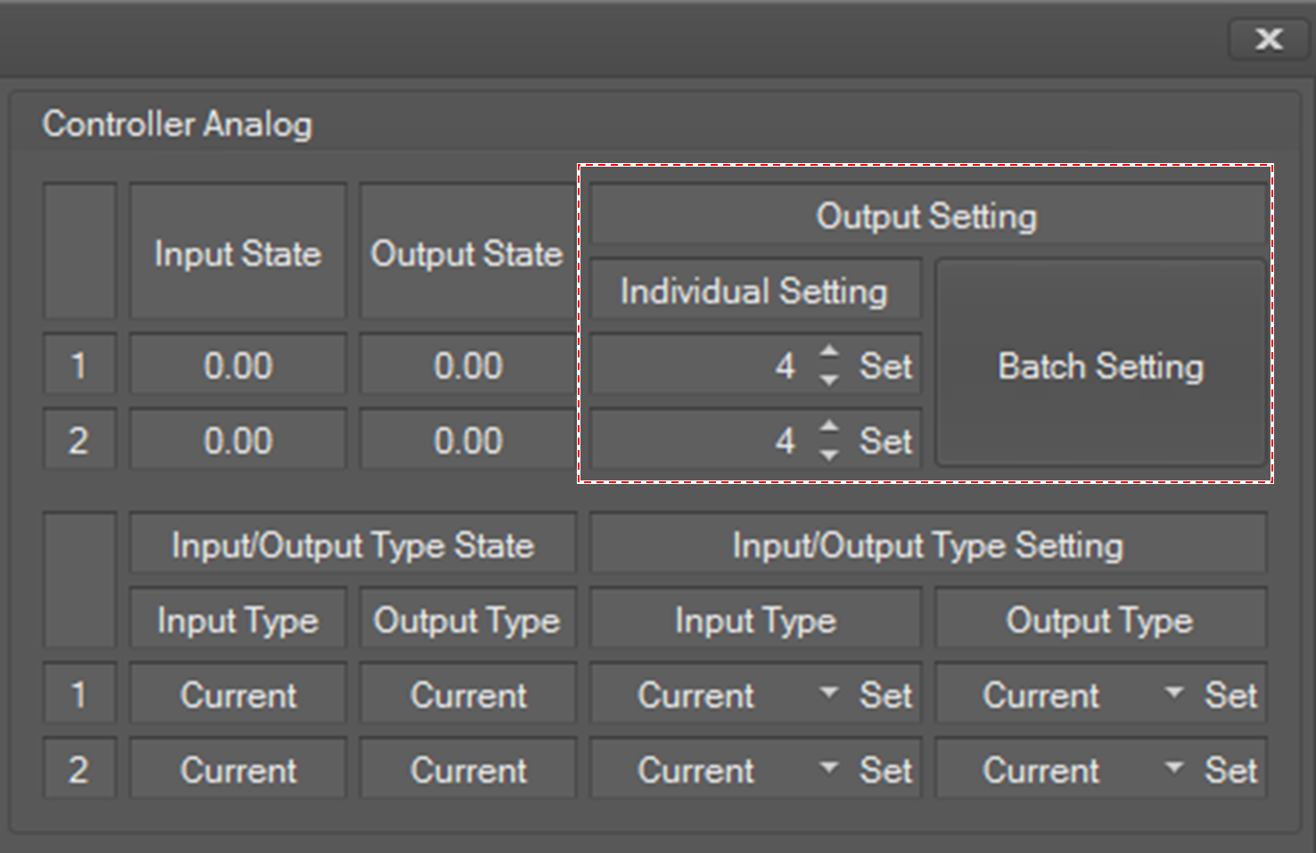 To set all output values at once, set the analog output fields and click the Batch Setting button.