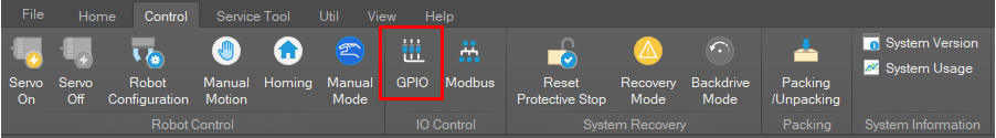 To monitor or set the IO of the controller and the robot arm flange, select Control on the main menu and click the GPIO button.