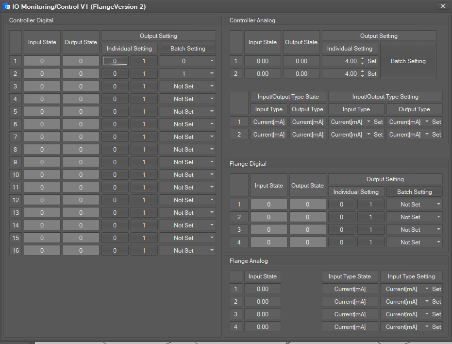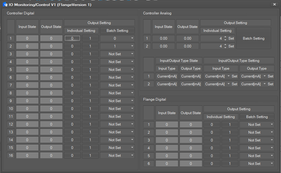The IO Monitoring / Control window is composed of three parts: Controller Digital/Analog setting and Flange Digital/Analog Setting.