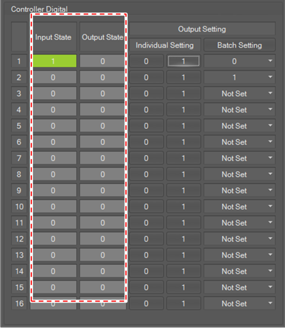The Digital IO state of the controller is displayed in the Input State/Output State field.