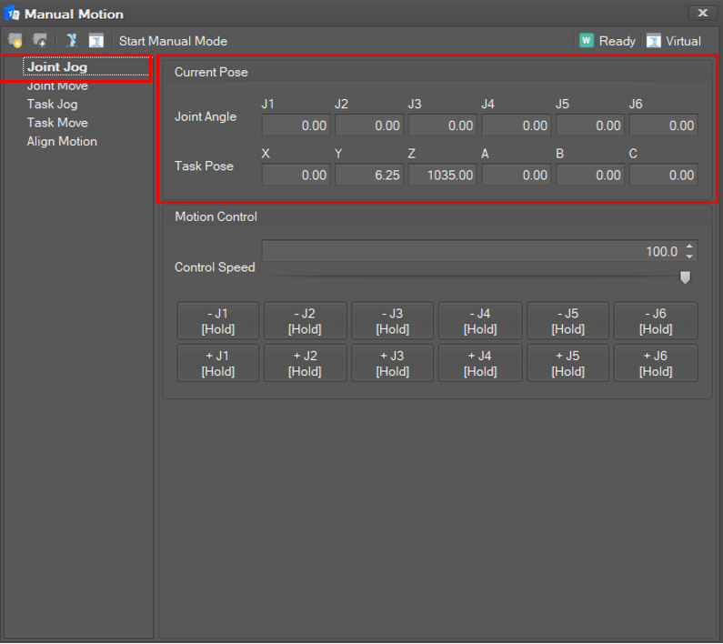 Select Joint Jog in the Manual Motion list. Then, the current joint angle and TCP position are displayed and updated in 100 milliseconds.