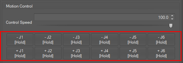 Jog speed is set in percent units. The joint angle speed for 100% is 30 degrees/seconds. To set the speed, click the spin button or move the slide bar.