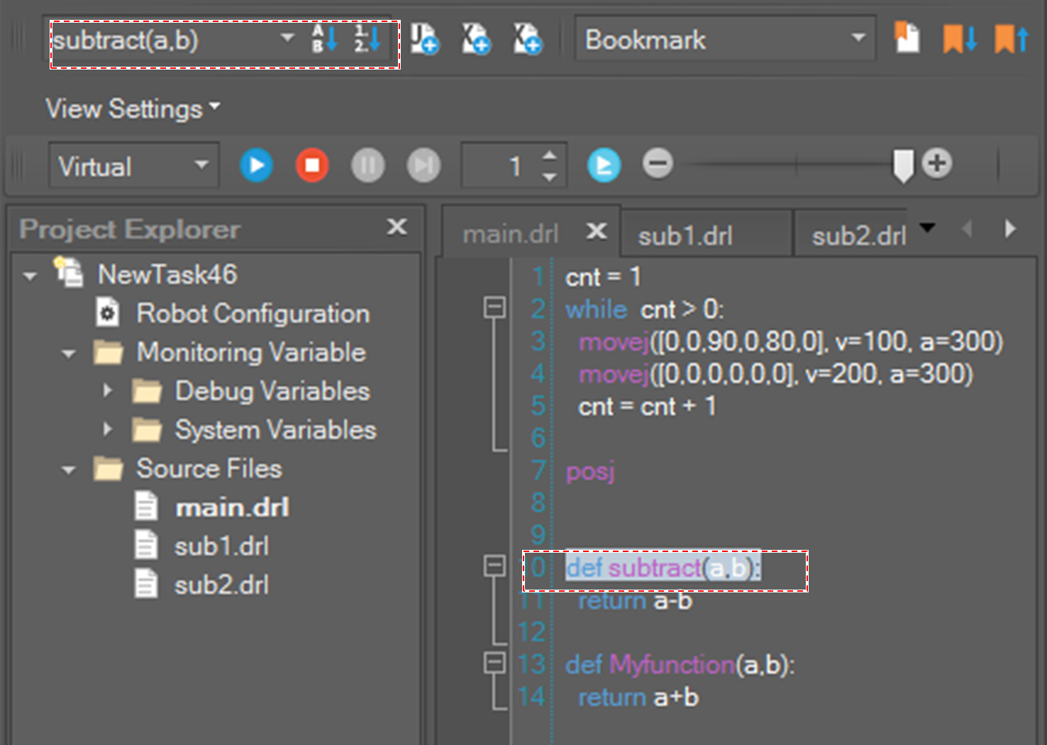 And if you select a function in the Function Outline list, the cursor goes to the line where the function is defined.