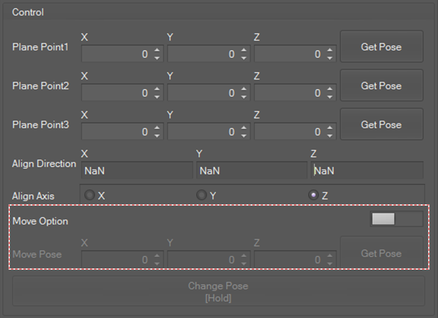 If the Target Coordinate Movement switch is on, the robot will move to the target position while changing the orientation of the tool. If the Target Coordinate Movement switch is off, the robot will change the orientation of the tool without changing the position.