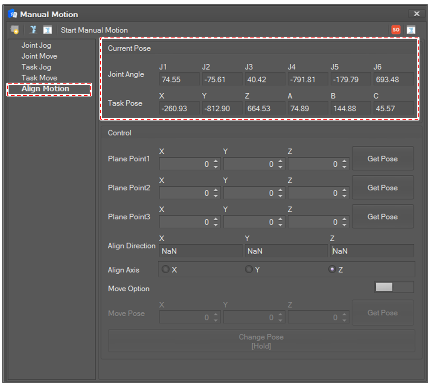 Select Align Motion in the Manual Motion list. Then, the current joint angles and TCP position are displayed and updated in 100 milliseconds.