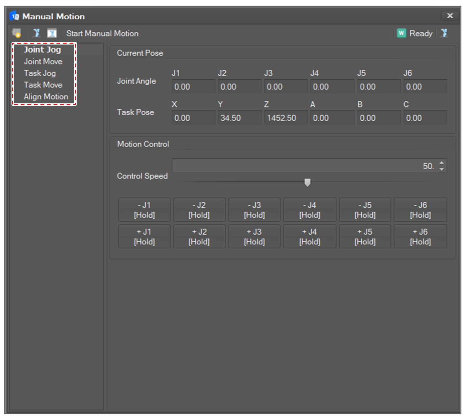 To control the robot motion manually, select Control on the main menu and click the Manual Motion button.
