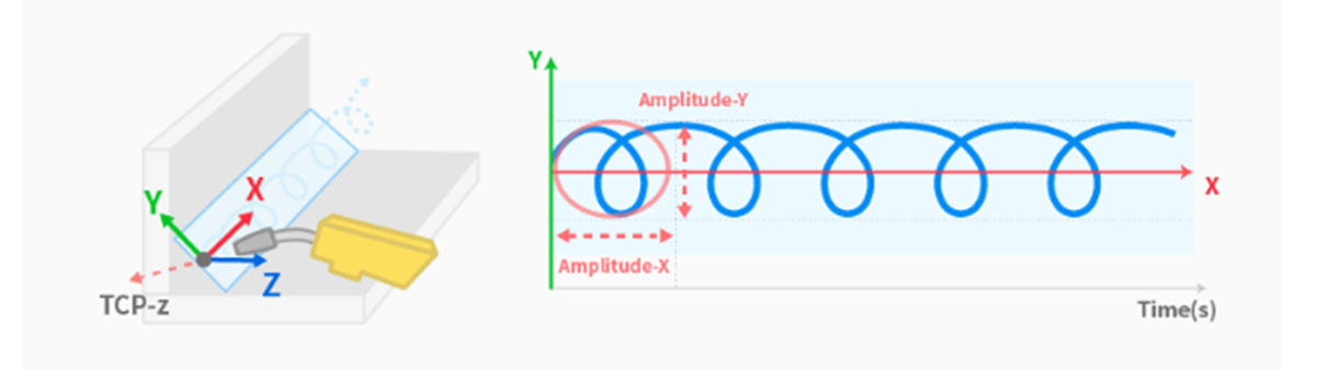 This sets the circular weaving condition. It is only valid within the welding section defined with the Enable Welding (app_weld_enable_analog()) and Disable Welding (app_weld_disable_analog()/ app_weld_disable_digital()) commands, and any operations starting at a point outside the welding section will generate an error. The weaving condition is defined by the weaving coordinates, which are defined with the TCP direction from the weaving x-axis as the weaving z-axis, and the vector-multiplied (cross product) direction as the weaving y-axis with the welding path direction as the weaving x-axis. Refer to the figure below for the coordinates and weaving setting factor. Only one weaving condition is allowed in a single welding section. The offset or weaving width can be adjusted during welding with the app_weld_adj_welding_cond_analog()/ app_weld_set_weld_cond_digital() command or the voltage/current/speed and the offset can be adjusted from the Welding Condition Adjustment popup of the teaching pendant. However, from the teaching pendant, welding condition adjustments are only available if the welding condition adjustment status is set to RESET using a command (the welding condition setting is designated with app_weld_set_weld_cond_analog()/app_weld_set_weld_cond_digital()).