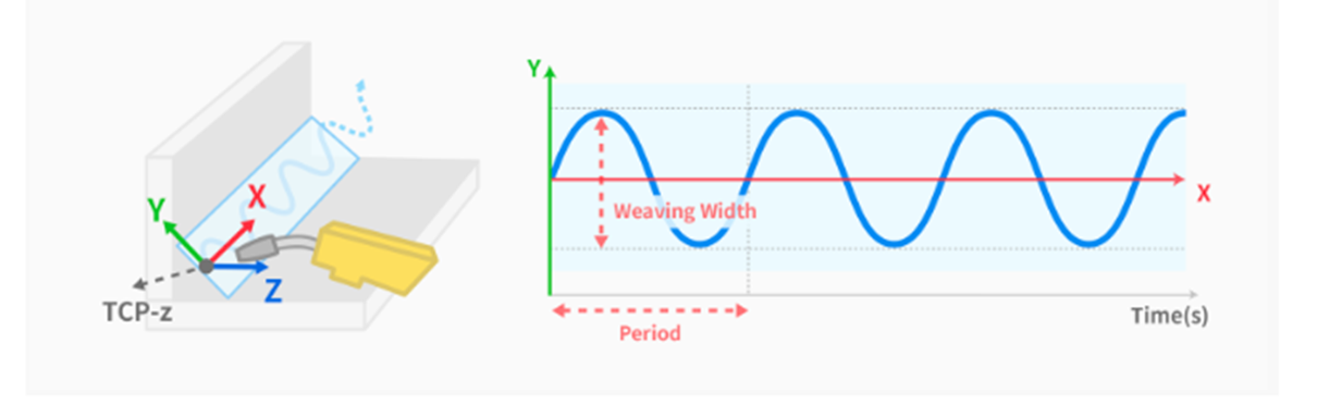 This sets the sinusoidal weaving condition. It is only valid within the welding section defined with the Enable Welding (app_weld_enable_analog()) and Disable Welding (app_weld_disable_analog()/ app_weld_disable_digital()) commands, and any operations starting at a point outside the welding section will generate an error. The weaving condition is defined by the weaving coordinates, which are defined with the TCP direction from the weaving x-axis as the weaving z-axis, and the vector-multiplied (cross product) direction as the weaving y-axis with the welding path direction as the weaving x-axis. Refer to the figure below for the coordinates and weaving setting factor. Only one weaving condition is allowed in a single welding section. The offset or weaving width can be adjusted during welding with the app_weld_adj_welding_cond_analog()/ app_weld_set_weld_cond_digital() command or the voltage/current/speed and the offset can be adjusted from the Welding Condition Adjustment popup of the teaching pendant. However, from the teaching pendant, welding condition adjustments are only available if the welding condition adjustment status is set to RESET using a command (the welding condition setting is designated with app_weld_set_weld_cond_analog()/app_weld_set_weld_cond_digital()).