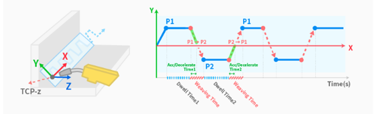 This sets the trapezoidal weaving condition. It is only valid within the welding section defined with the Enable Welding (app_weld_enable_analog()) and Disable Welding (app_weld_disable_analog()/ app_weld_disable_digital()) commands, and any operations starting at a point outside the welding section will generate an error. The weaving condition is defined by the weaving coordinates, which are defined with the TCP direction from the weaving x-axis as the weaving z-axis, and the vector-multiplied (cross product) direction as the weaving y-axis with the welding path direction as the weaving x-axis. Refer to the figure below for the coordinates and weaving setting factor. Only one weaving condition is allowed in a single welding section. The offset or weaving width can be adjusted during welding with the app_weld_adj_welding_cond_analog()/ app_weld_set_weld_cond_digital() command or the voltage/current/speed and the offset can be adjusted from the Welding Condition Adjustment popup of the teaching pendant. However, from the teaching pendant, welding condition adjustments are only available if the welding condition adjustment status is set to RESET using a command (the welding condition setting is designated with app_weld_set_weld_cond_analog()/app_weld_set_weld_cond_digital()).