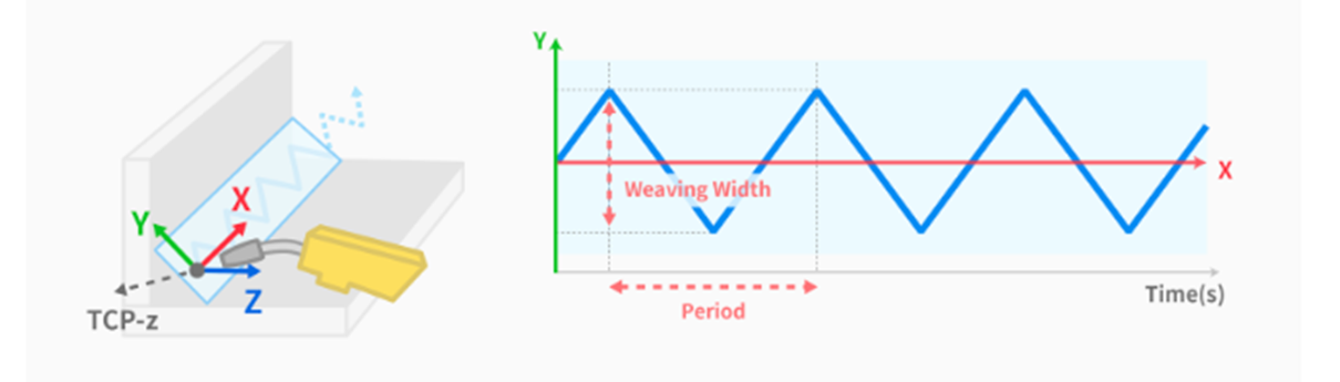 This sets the zigzag weaving condition. It is only valid within the welding section defined with the Enable Welding (app_weld_enable_analog()) and Disable Welding (app_weld_disable_analog()/ app_weld_disable_digital()) commands, and any operations starting at a point outside the welding section will generate an error. The weaving condition is defined by the weaving coordinates, which are defined with the TCP direction from the weaving x-axis as the weaving z-axis, and the vector-multiplied (cross product) direction as the weaving y-axis with the welding path direction as the weaving x-axis. Refer to the figure below for the coordinates and weaving setting factor. Only one weaving condition is allowed in a single welding section. The offset or weaving width can be adjusted during welding with the app_weld_adj_welding_cond_analog()/ app_weld_set_weld_cond_digital() command or the voltage/current/speed and the offset can be adjusted from the Welding Condition Adjustment popup of the teaching pendant. However, from the teaching pendant, welding condition adjustments are only available if the welding condition adjustment status is set to RESET using a command (the welding condition setting is designated with app_weld_set_weld_cond_analog()/app_weld_set_weld_cond_digital()).