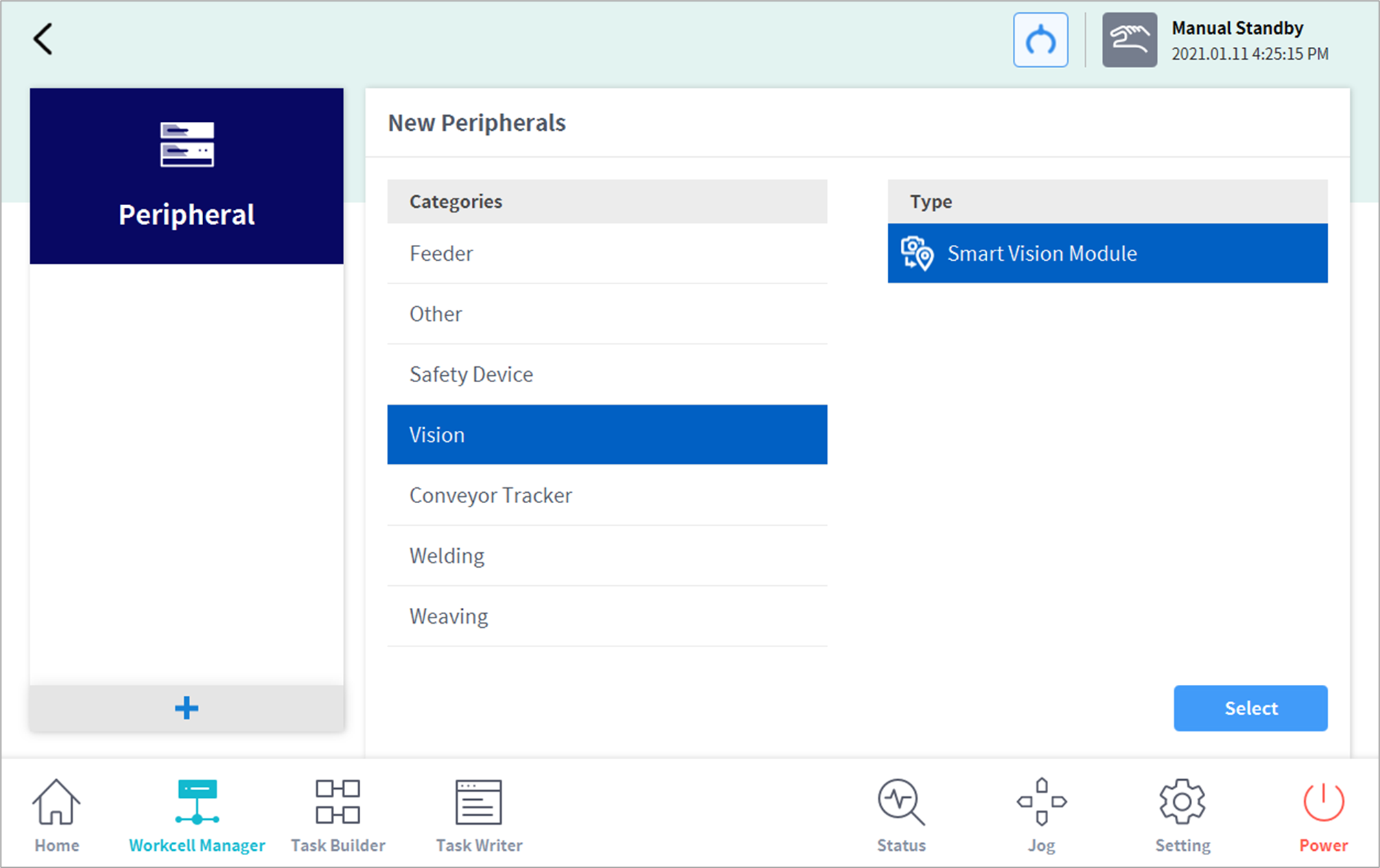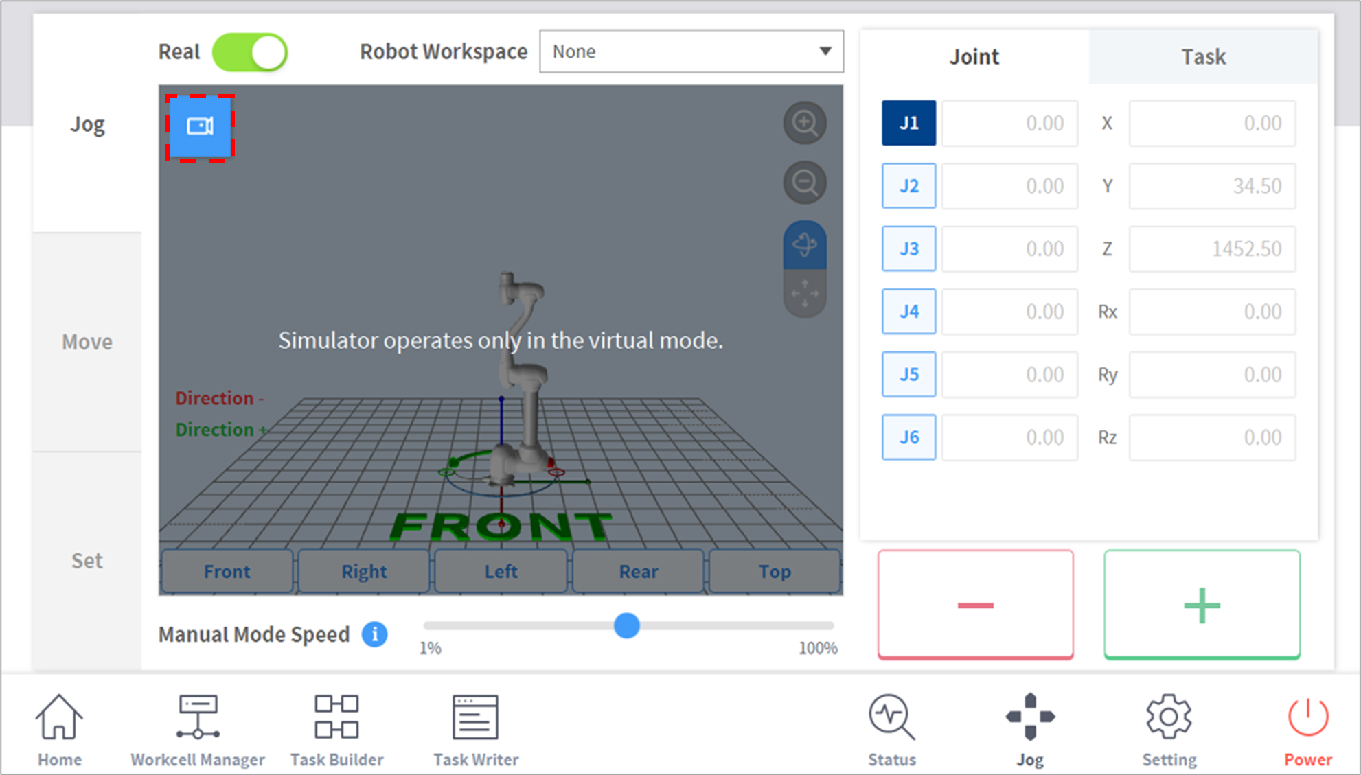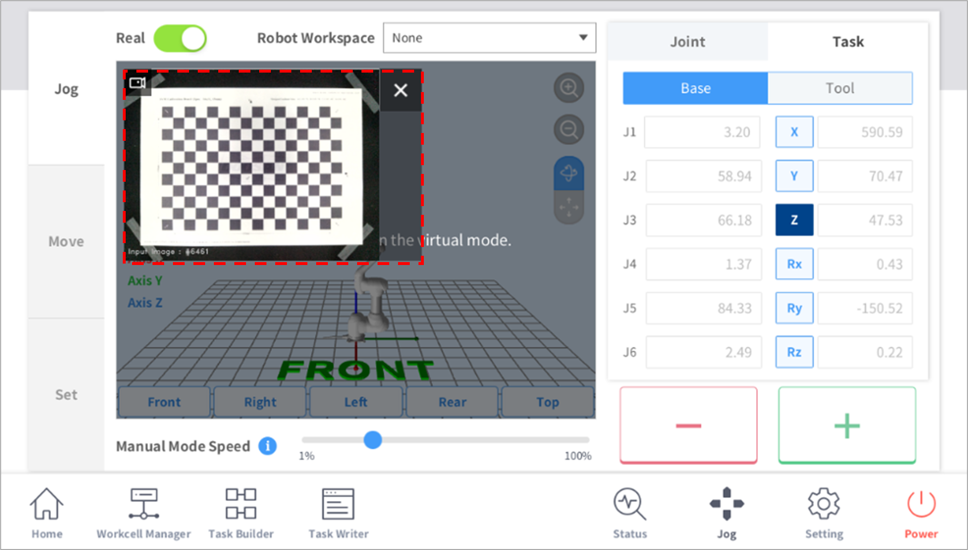 If the Vision license is entered, a live image can be viewed in the Jog tab. The user can operate the robot while viewing the live image.
