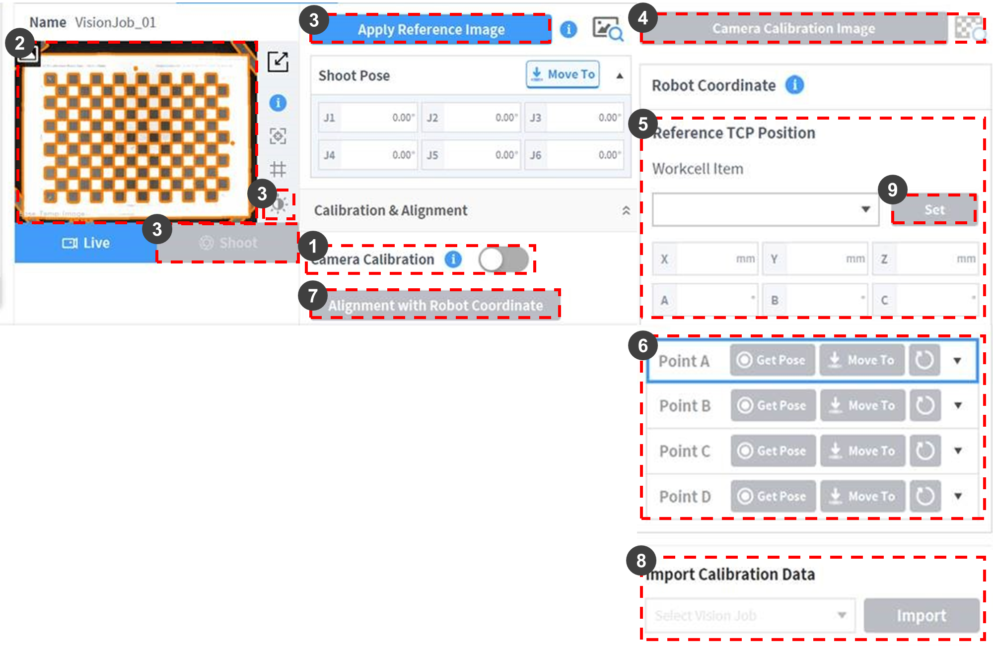8 | Import Calibration Data | Imports calibration data that succeeded in existing vision works. • Select a vision work to import the calibration data and press the import button to save the corresponding calibration data. |