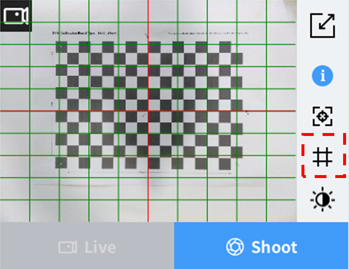 2 | Live/Shoot Image | The Live/Shoot Image can be checked. To ensure proper camera calibration, a checkerboard is placed as follows:
