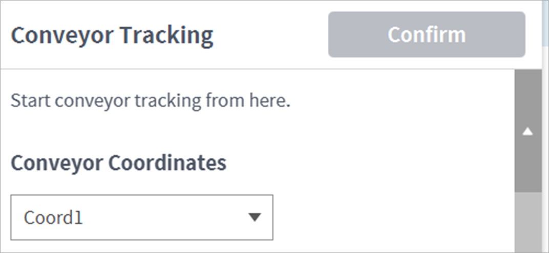The End Conveyor Tracking line decelerates to allow the robot to stop conveyor tracking. Default acceleration time is 0.3 s, and to adjust it, the drl command tracking_conveyor must be used under Custom Code. As it proceeds to the next line as soon as it accelerates to reduce takt time, when a task motion is encountered, it overlaps with the deceleration motion. However, as Joint Motion cannot be performed during deceleration, if Joint Motion is required immediately after End Conveyor Tracking, perform Wait for 0.3 s or perform Task Motion for more than 0.3 s before performing Joint Motion.