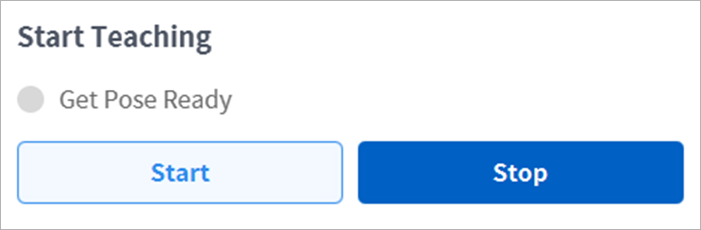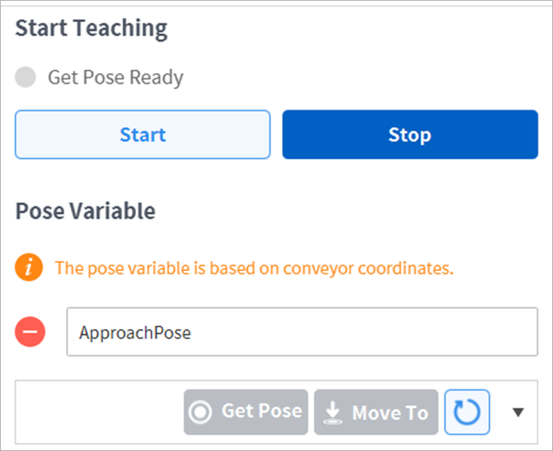 - When a workpiece enters the monitoring section, a green indicator lights goes on at Get Pose Ready. After the indicator light goes on, stop the conveyor in a position where the robot can perform teaching properly. If the green indicator light does not go on, press Stop and restart the process.
