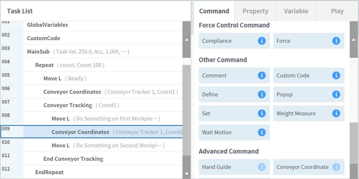 This example handles workpieces continuously supplied by one conveyor. If a workpiece is handled between Conveyor Tracking and End Conveyor Tracking, and if the overall work time is not sufficient, obtain Conveyor Coordinates information rather than performing End Conveyor Tracking to continue the work.