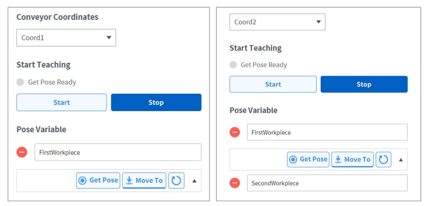Note that it is necessary to differentiate the first coordinates and the second coordinates when teaching. Select coordinates suited for the workpiece, perform Start Teaching, and perform Get Pose to obtain teaching points suited for each coordinate. If the workpiece is identical, it is acceptable to share identical teaching points.