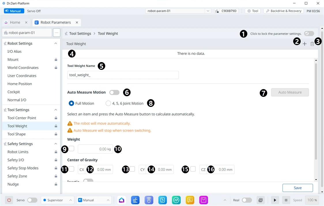 - It is recommended to add tool weight as Workcell Items for each tool with a workpiece. If the workpiece weight is too heavy, the robot may recognize the weight of the workpiece as external force. It is because the robot determines this external force as a collision and stops.