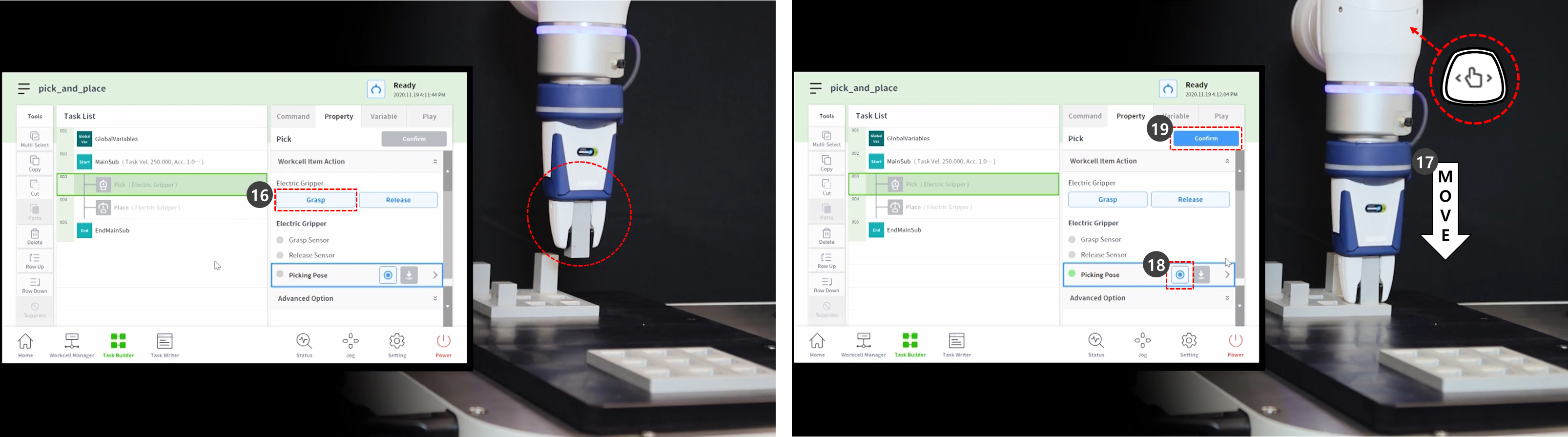 - Use direct teaching to move the robot to the point where Pick will be performed.