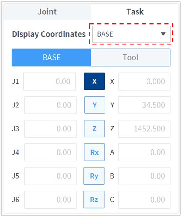 - Select the display coordinates to be used as the base and select the Base as the reference point of the task coordinates.